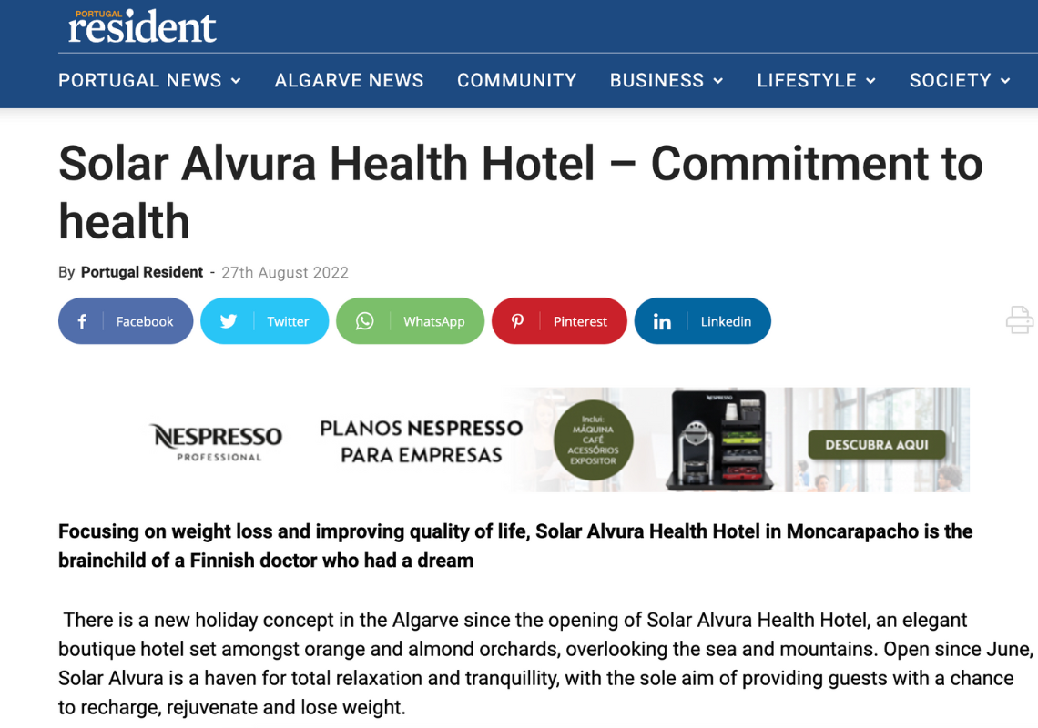 Eva Orsmond chose Pés do Cerro, in Moncarapacho, in the heart of the Algarve barrocal, to install the Solar Alvura Health Hotel, a small unit opened on June 22, which promises to be «a place to recharge your batteries». Among orange and almond orchards and overlooking the sea, this health tourism project aims to provide guests with a «health and well-being retreat». The idea came more than 20 years ago, when she founded his clinics in Ireland, Dublin and Galway, focused on weight loss and the reversal of type 2 of diabetes.